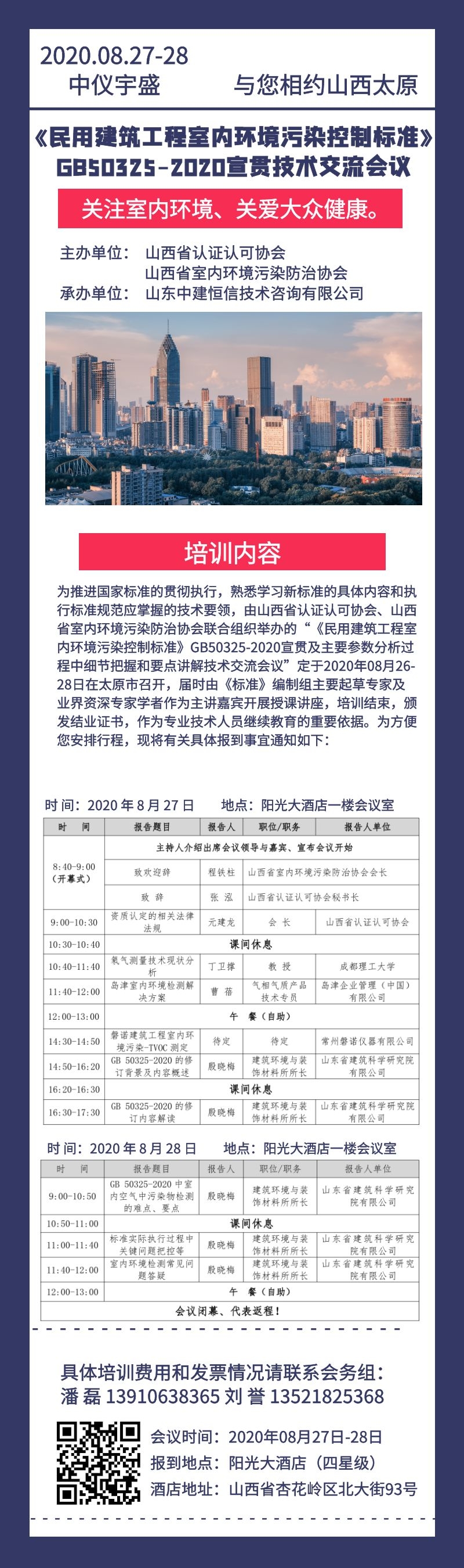 關注室內環(huán)境、關愛大眾健康。相約太原!《民用建筑工程室內環(huán)境污染控制標準》GB50325-2020宣貫技術交流會議 更新日期:2020-08-26